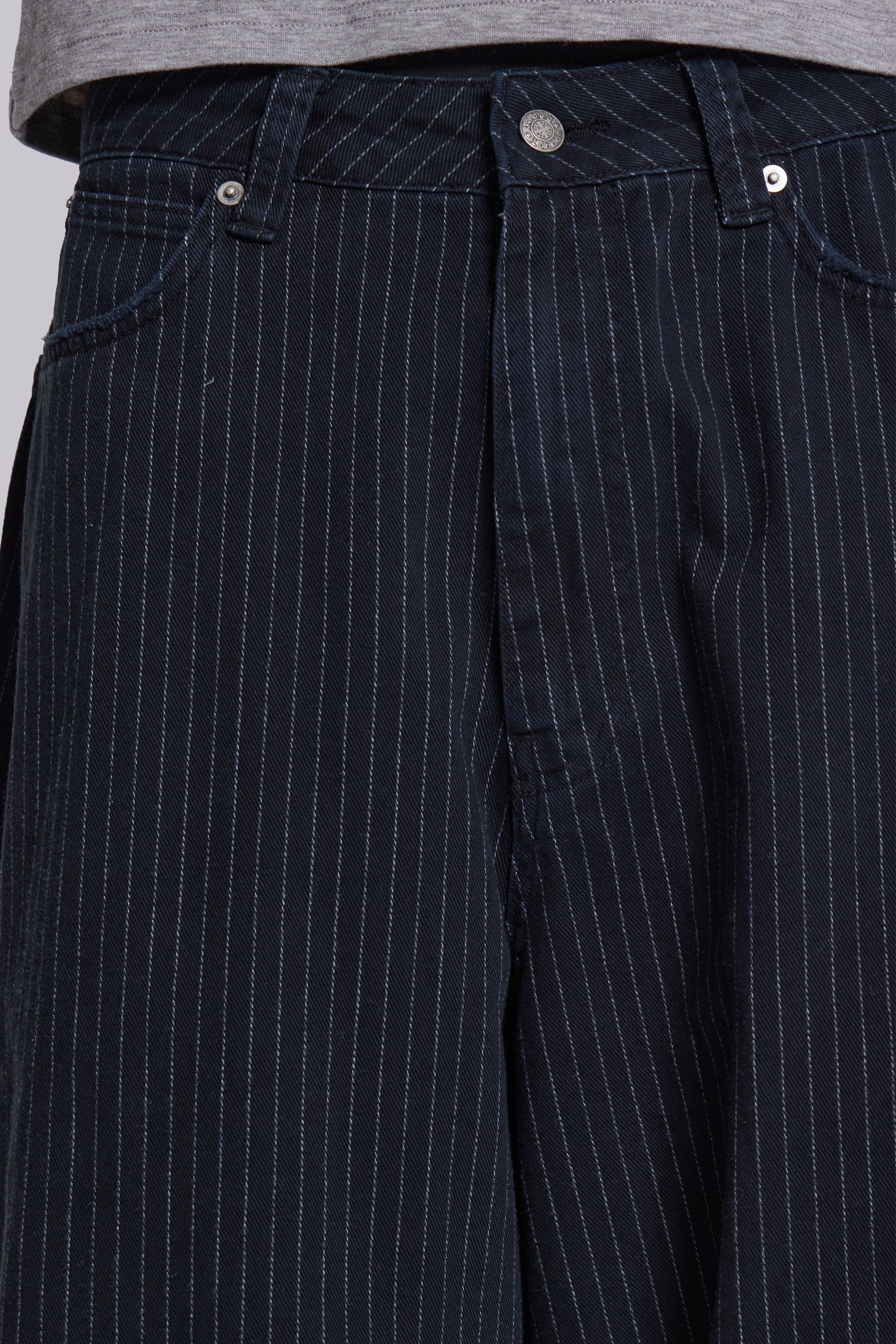 The Black Pinstripe XL Colossus Jeans are cut in our relaxed XL Colossus fit, crafted from rigid cotton denim with a pinstripe design in black and white. Finished with six-pocket styling and antique silver hardware.