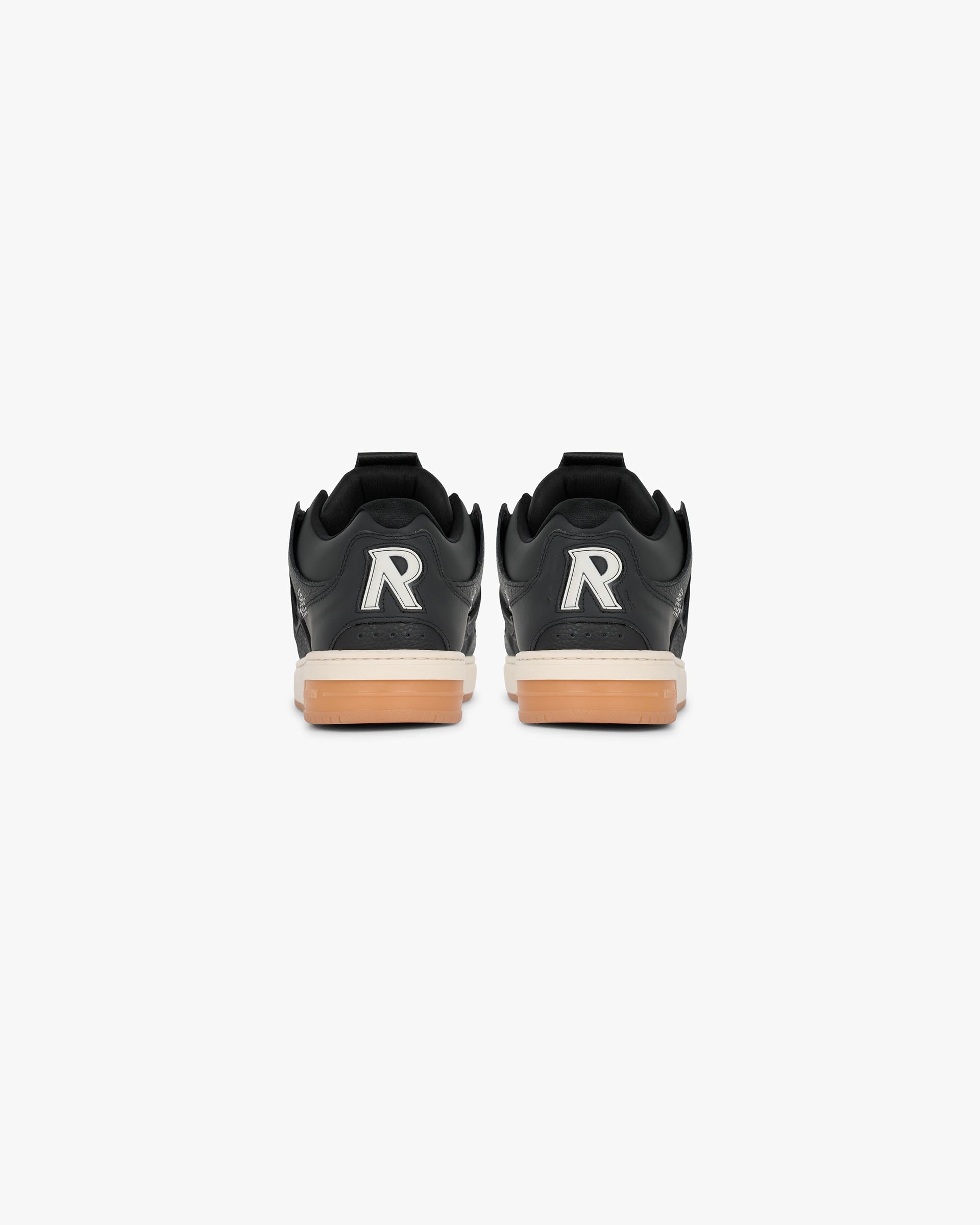 The Bully Sneaker is designed with a retro skate influence, featuring a flat leather base with tumbled leather panelling. A TPU exoskeleton with tonal embossed details adds structure, complemented by zigzag stitching and a contrasting heel accent. The padded collar and chunky lacing provide support and stability.
