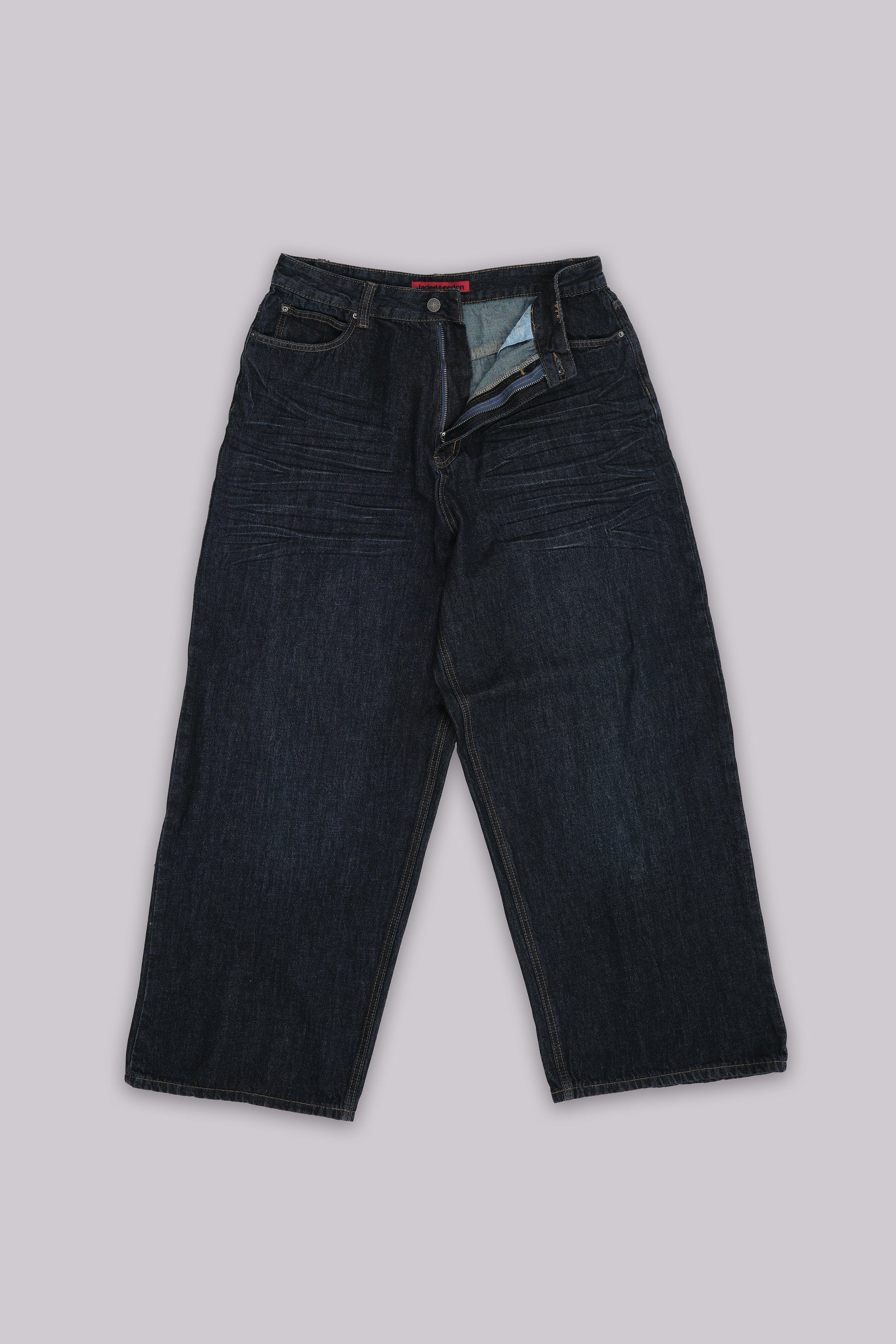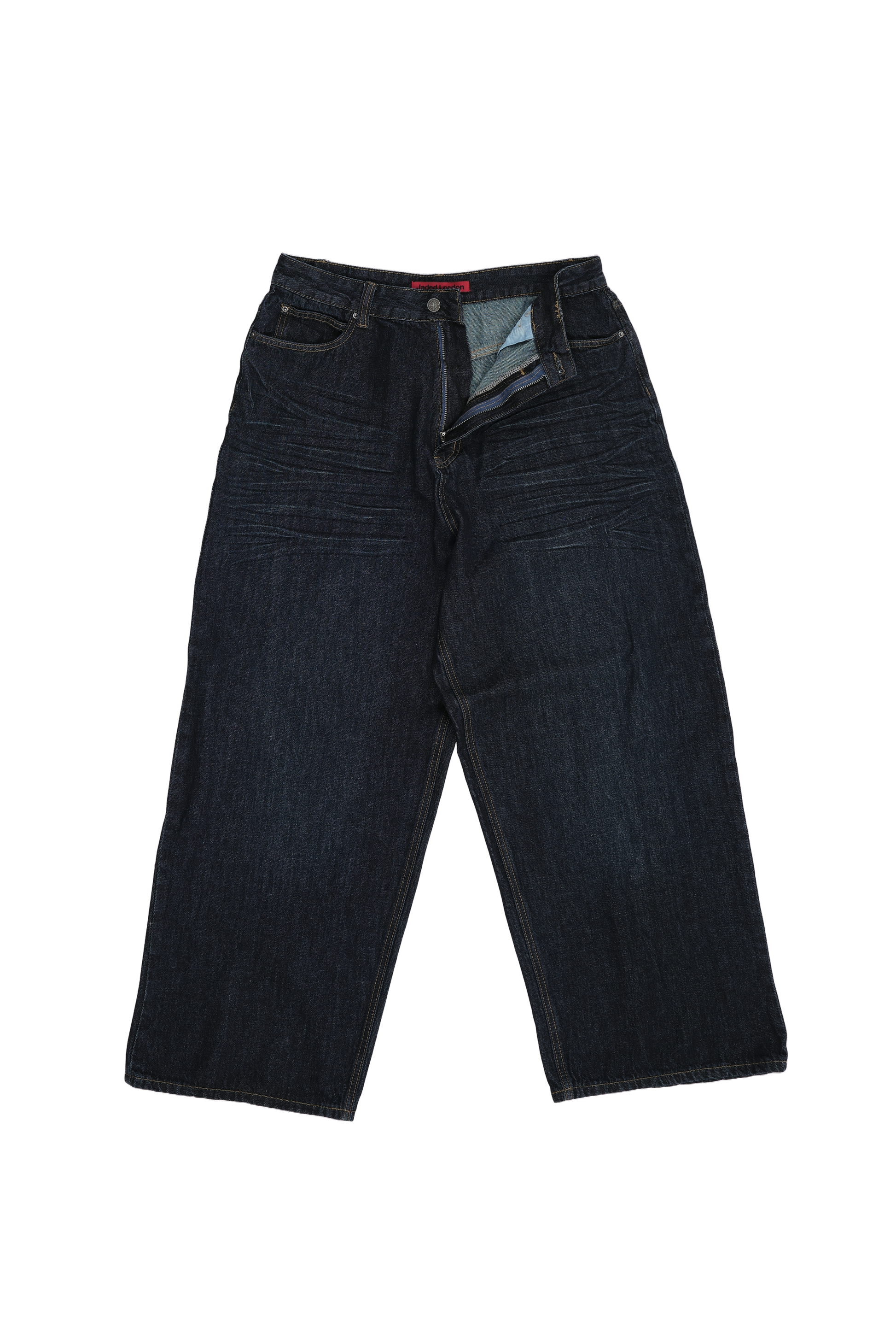 The Creased Indigo XL Colossus Jeans feature a wider silhouette, drawing inspiration from 1990s skate styles. Made from heavy non-stretch indigo denim with crease-treated front whiskers, these jeans are built for a relaxed, oversized look while maintaining a structured shape.