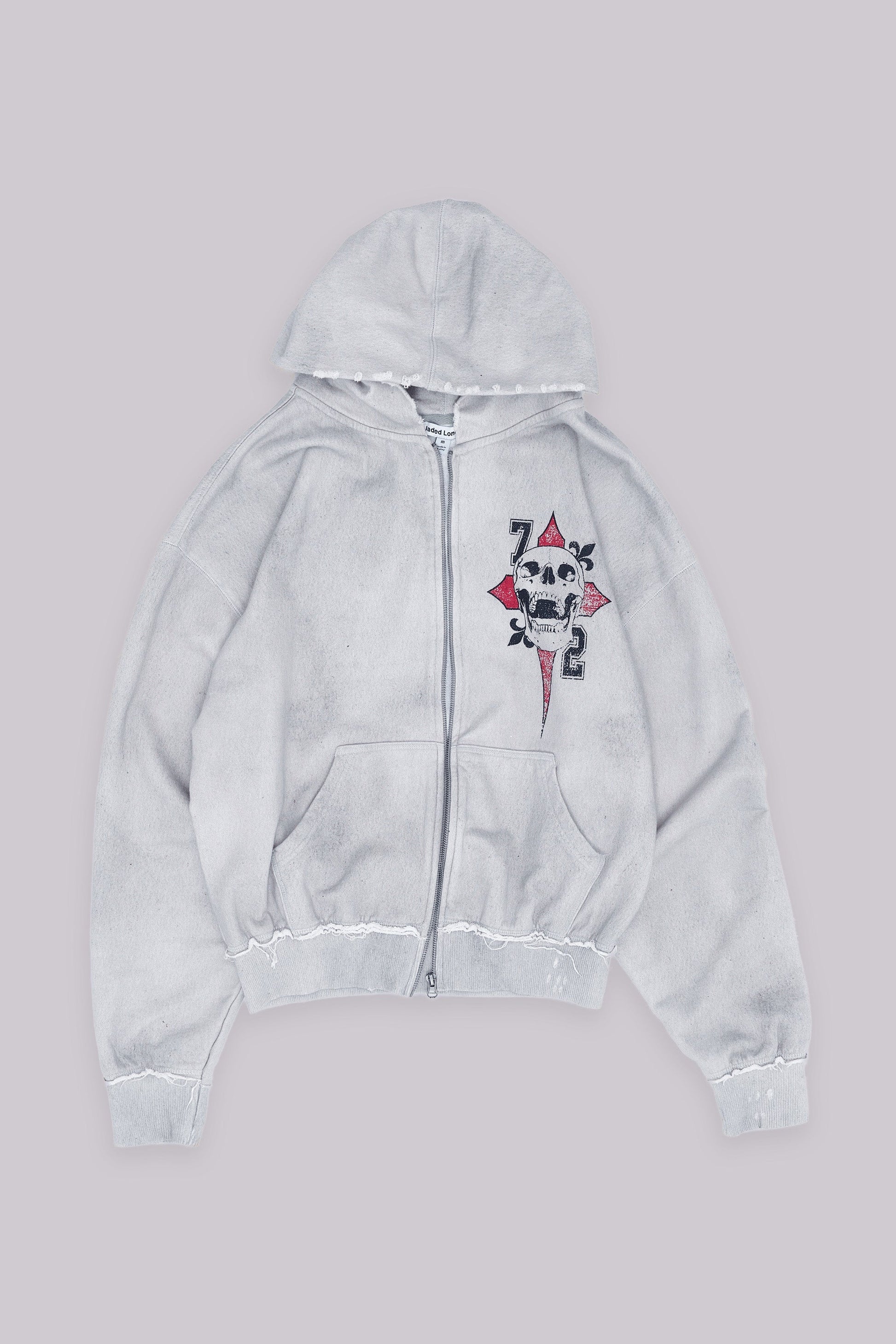 - Heavy garment wash with raw edge hem and cuffs